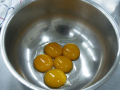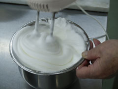 3.中ボウルに卵白を入れ8分立てにし、砂糖35gを2回に分けて加え、しっかりと泡立てる。(メレンゲ) |