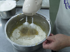 5.3.の卵白(メレンゲ)から1/3量をとり4.のボウルに加えハンドミキサーで混ぜ合わせる。 |