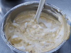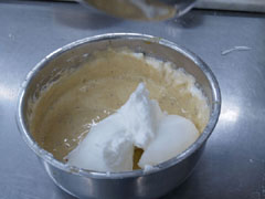 7.最後に残りの卵白(メレンゲ)を入れてサックリと泡が消えないように混ぜシフォン型に流し1.の6コートに入れて約30~40分焼く。 |