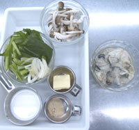 ①小松菜は3cmの長さに切る。玉ねぎは薄切りにする。しめじは石突きを除いてほぐす。コンソメは粗く砕く。カキは片栗粉少々でもんで洗い、水で2~3回洗ってペーパーなどで水気を切る。 |