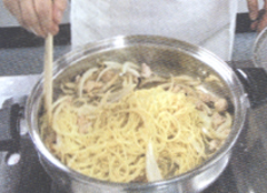④蒸気が上がったらフタを開け、鶏肉に火が通っていることを確認し、②の麺を戻し、混ぜ合わせてコショウで味を調える。 |