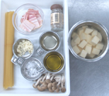 ④③を片側に寄せて、オリーブ油(大さじ3)・にんにく・ベーコン・しめじを加えて中火で炒める。塩・コショウで味を調えて火を止めて白ワインを入れ、全体を混ぜる。 |