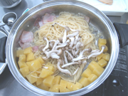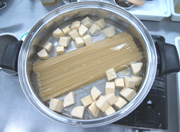 ③蒸気が出てきたらスパゲッティをしっかりさばいてフタをする。再び蒸気が出てきたらほたる火にして袋に表記のゆで時間より少し短めの時間ゆがく。 |