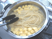 ②大フライパンにスパゲッティ・分量の水・オリーブ油(小さじ1)・さつまいもを入れて中火にかける。 |